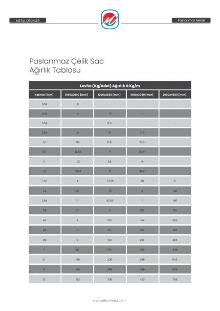 Paslanmaz Çelik Sac Ağırlık Tablosu