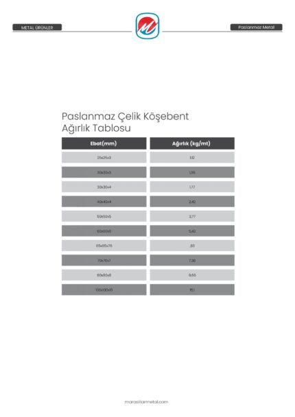 Paslanmaz Çelik Köşebent Ağırlık Tablosu