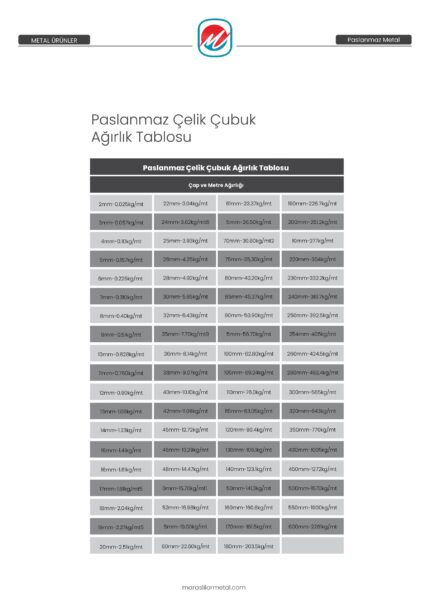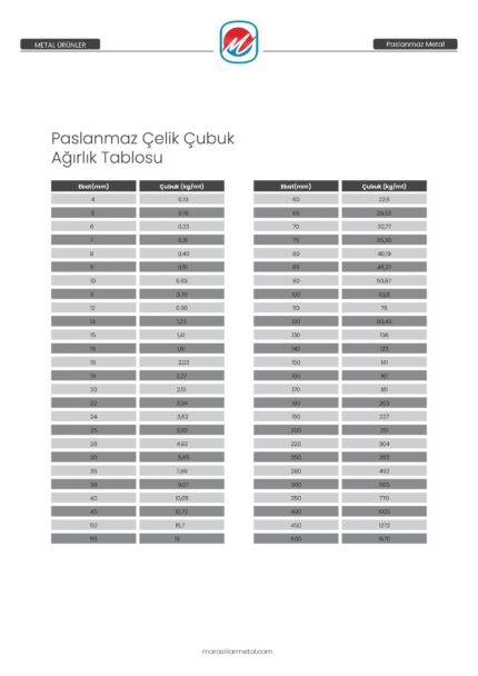 Paslanmaz Çelik Çubuk Ağırlık Tablosu