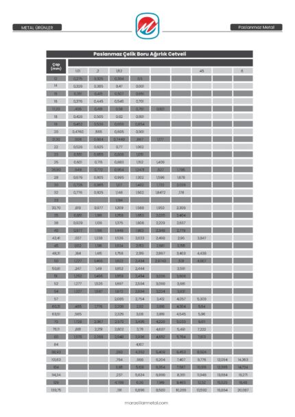 Paslanmaz Çelik Boru Ağırlık Tablosu