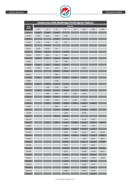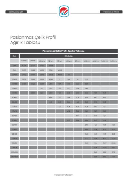 Paslanmaz Çelik Profil Ağırlık Tablosu