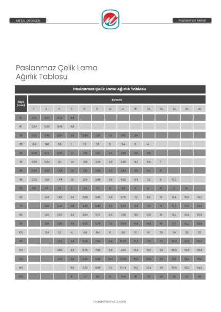 Paslanmaz Çelik Lama Ağırlık Tablosu