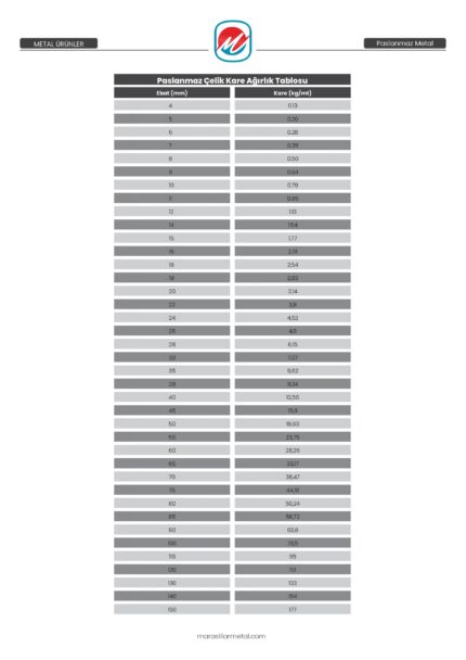 Paslanmaz Çelik Kare Ağırlık Tablosu