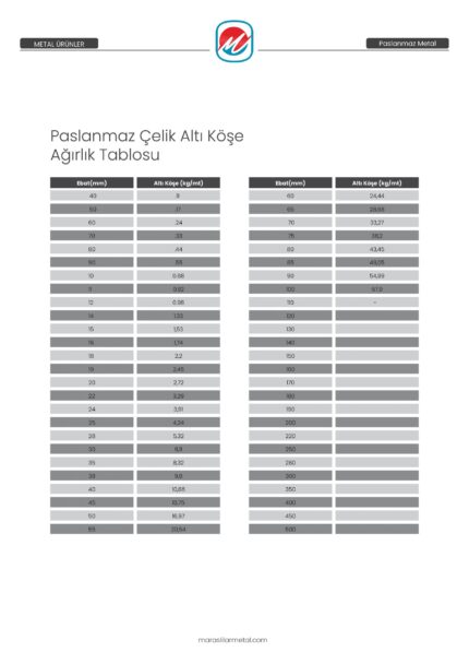 Paslanmaz Çelik Altı Köşe Ağırlık Tablosu