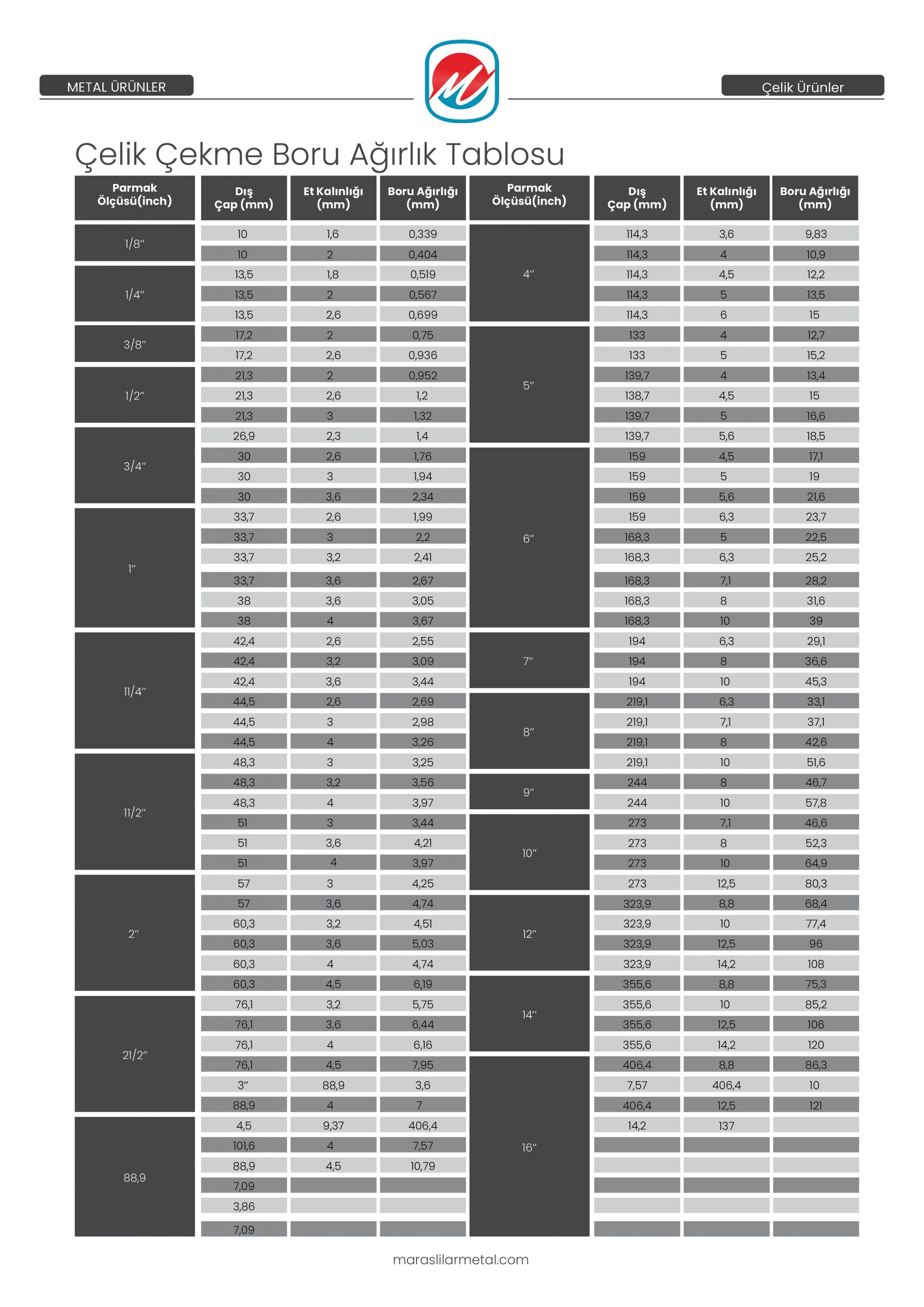 Çelik Çekme Boru Ağırlık Tablosu