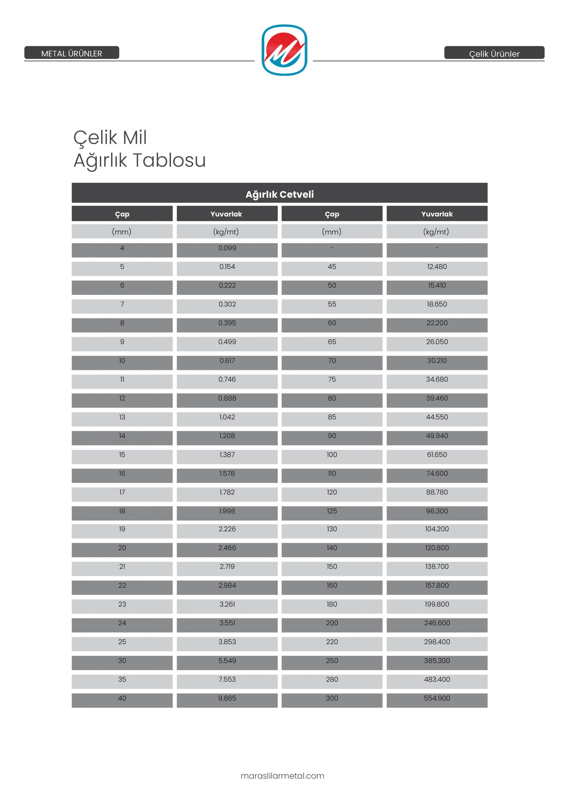 Paslanmaz Çelik Çubuk Ağırlık Tablosu