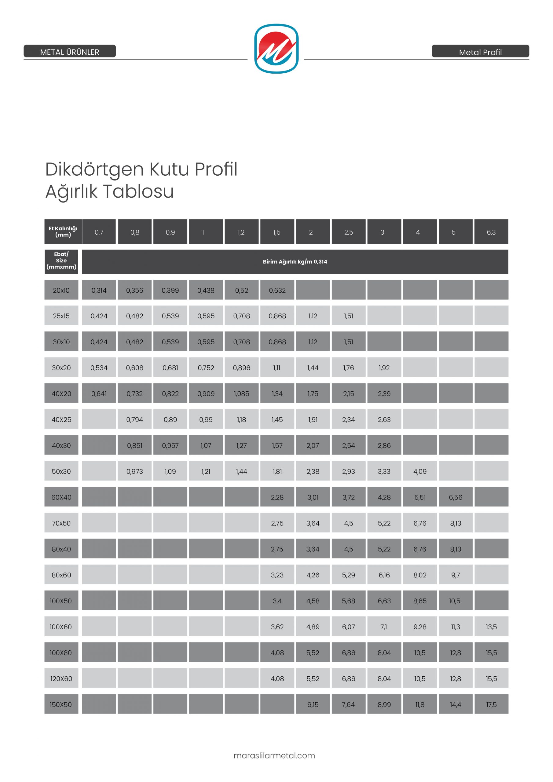 Dikdörtgen Kutu Profil Ağırlık tablosu