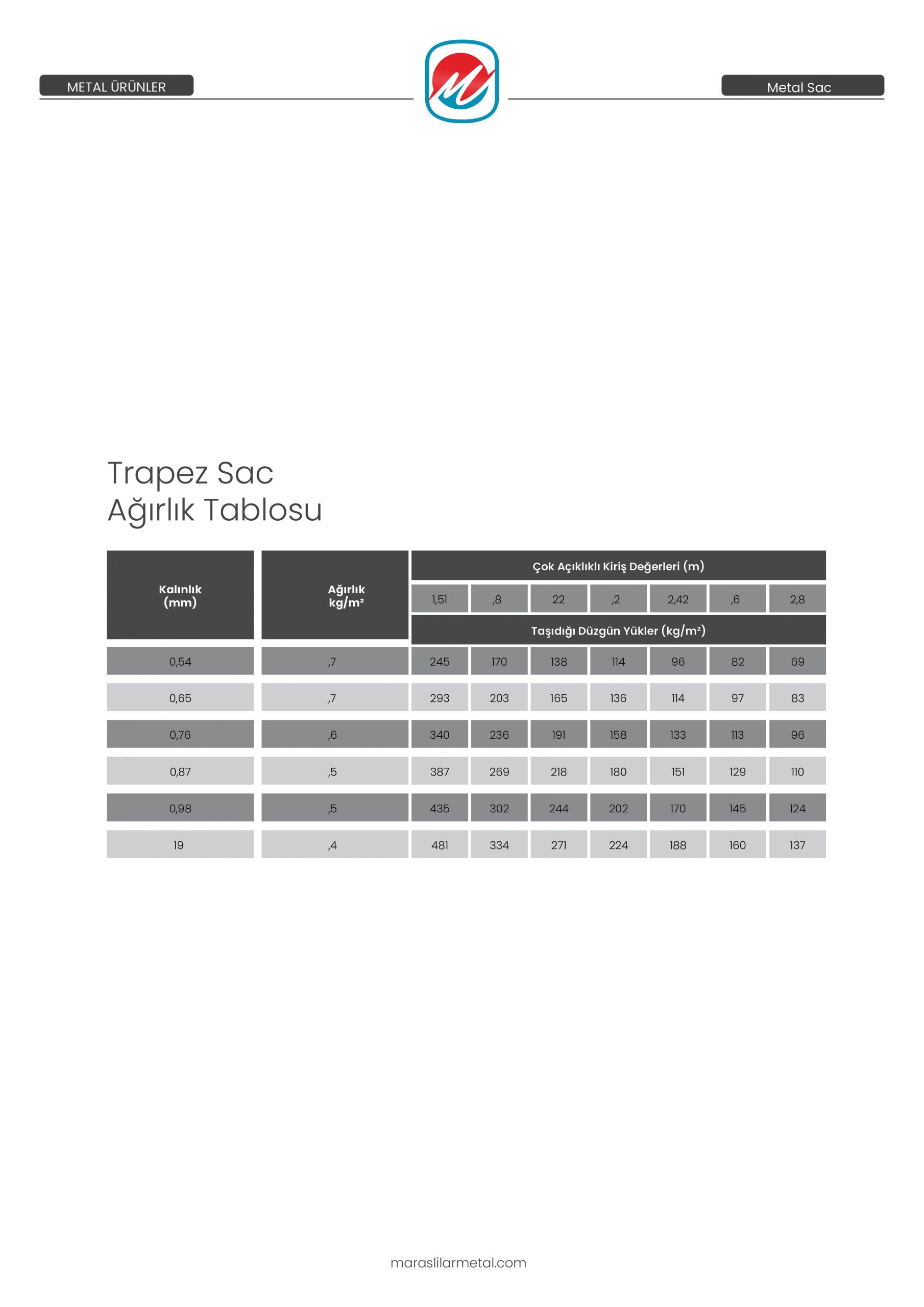 Trapez Sac Ağırlık Tablosu